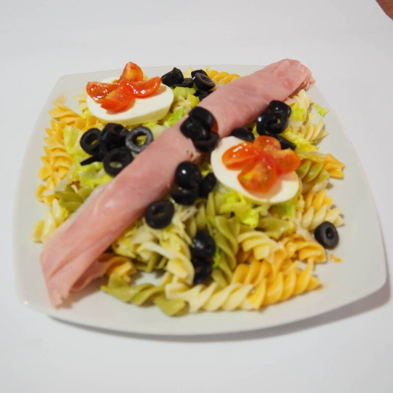 Fusil tricolor, jamón dulce, huevo duro y aceitunas negras